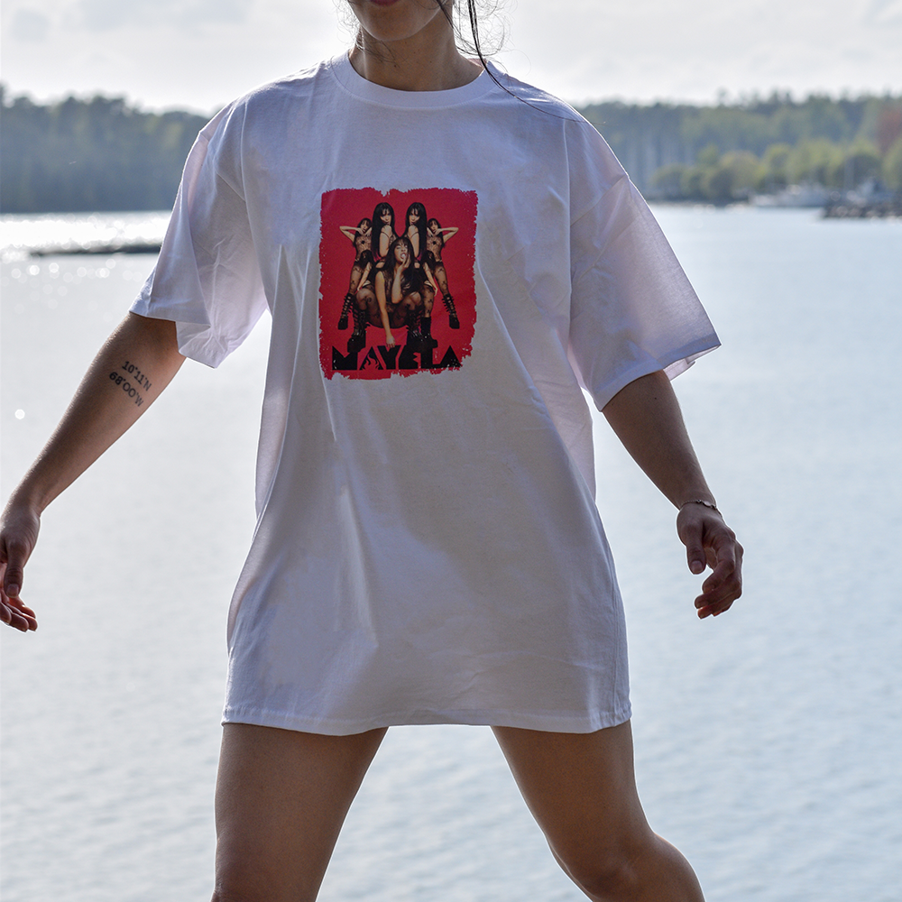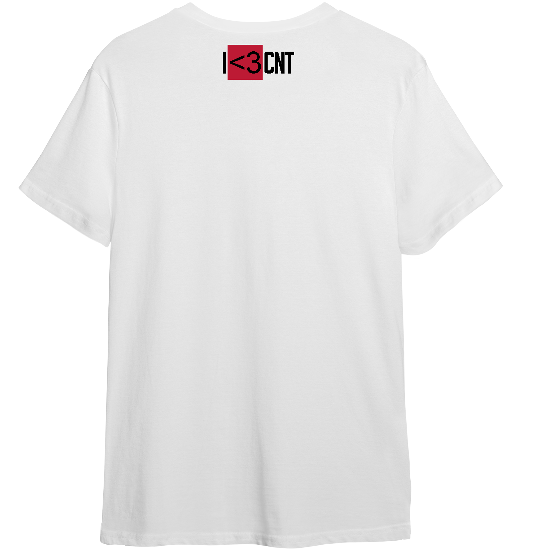 White T-shirt featuring “The Mayelas” graphics on the front and “I <3 CNT” graphics on the back.