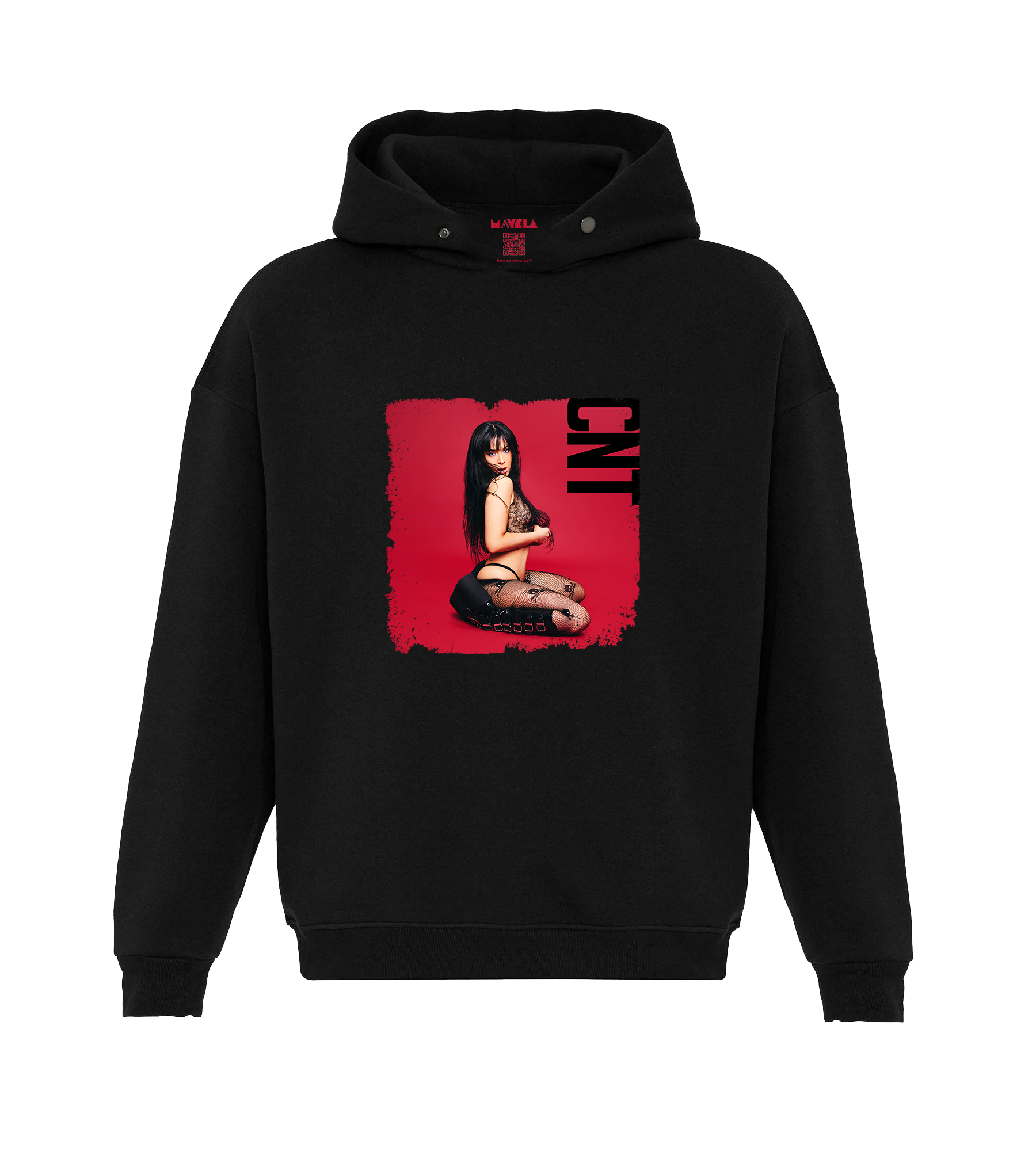 Black hoodie featuring “The OG Mayela” graphics on the front.